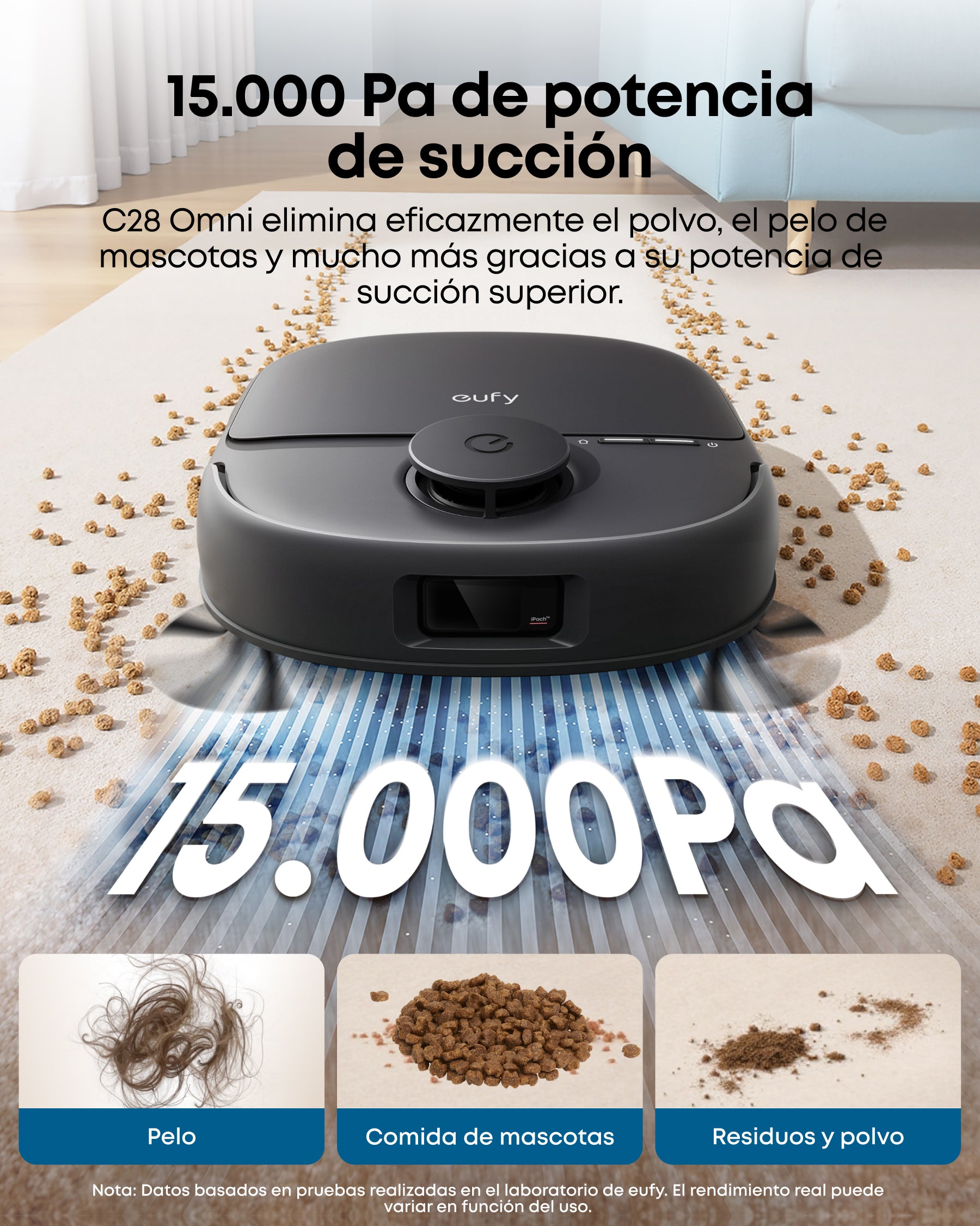 - Potente succión de 15 000 Pa: la avanzada tecnología de succión del C28 Omni recoge fácilmente el pelo, la caspa animal e incluso el polvo más fino de cualquier suelo, para que puedas disfrutar de un hogar más limpio y fresco.